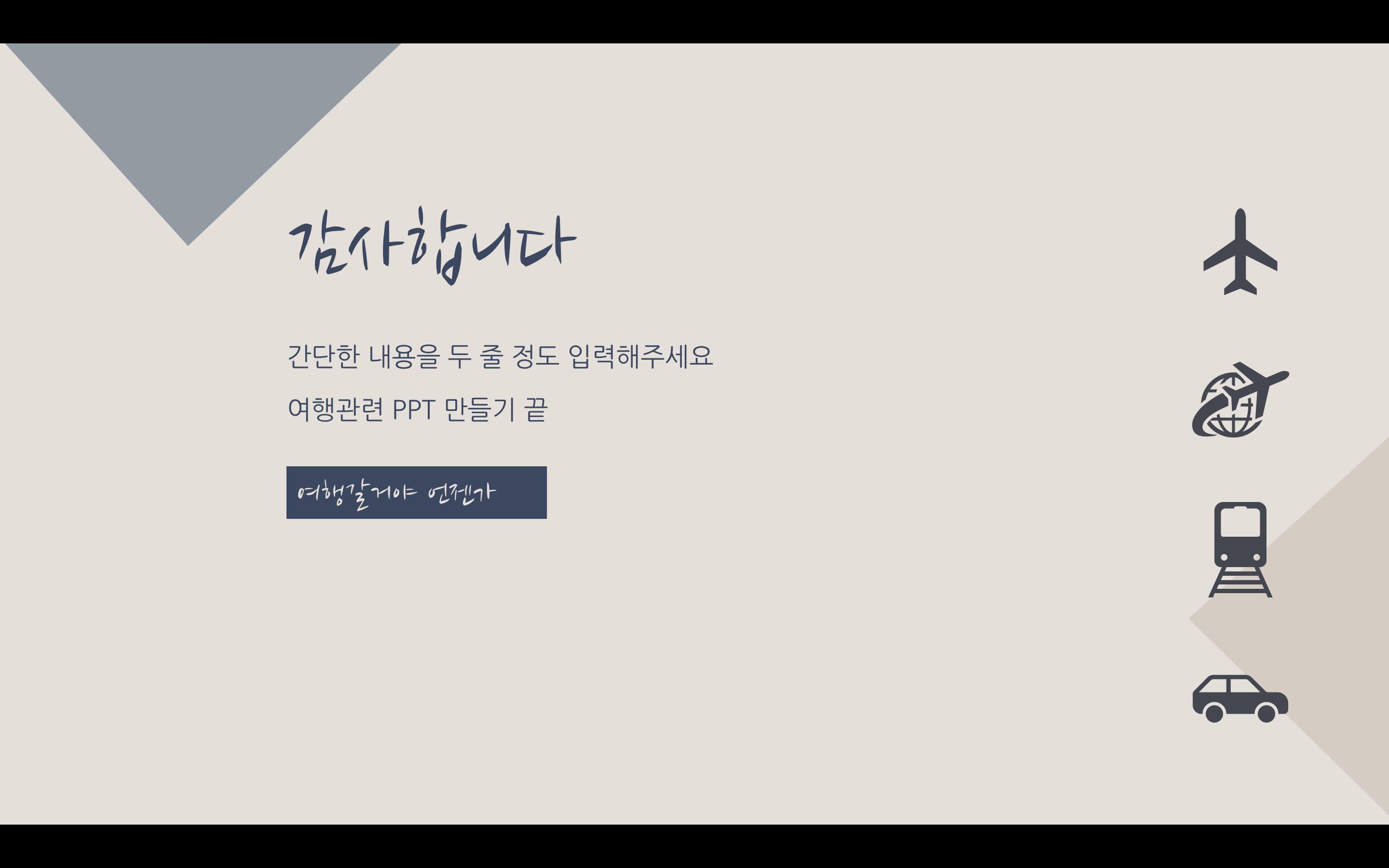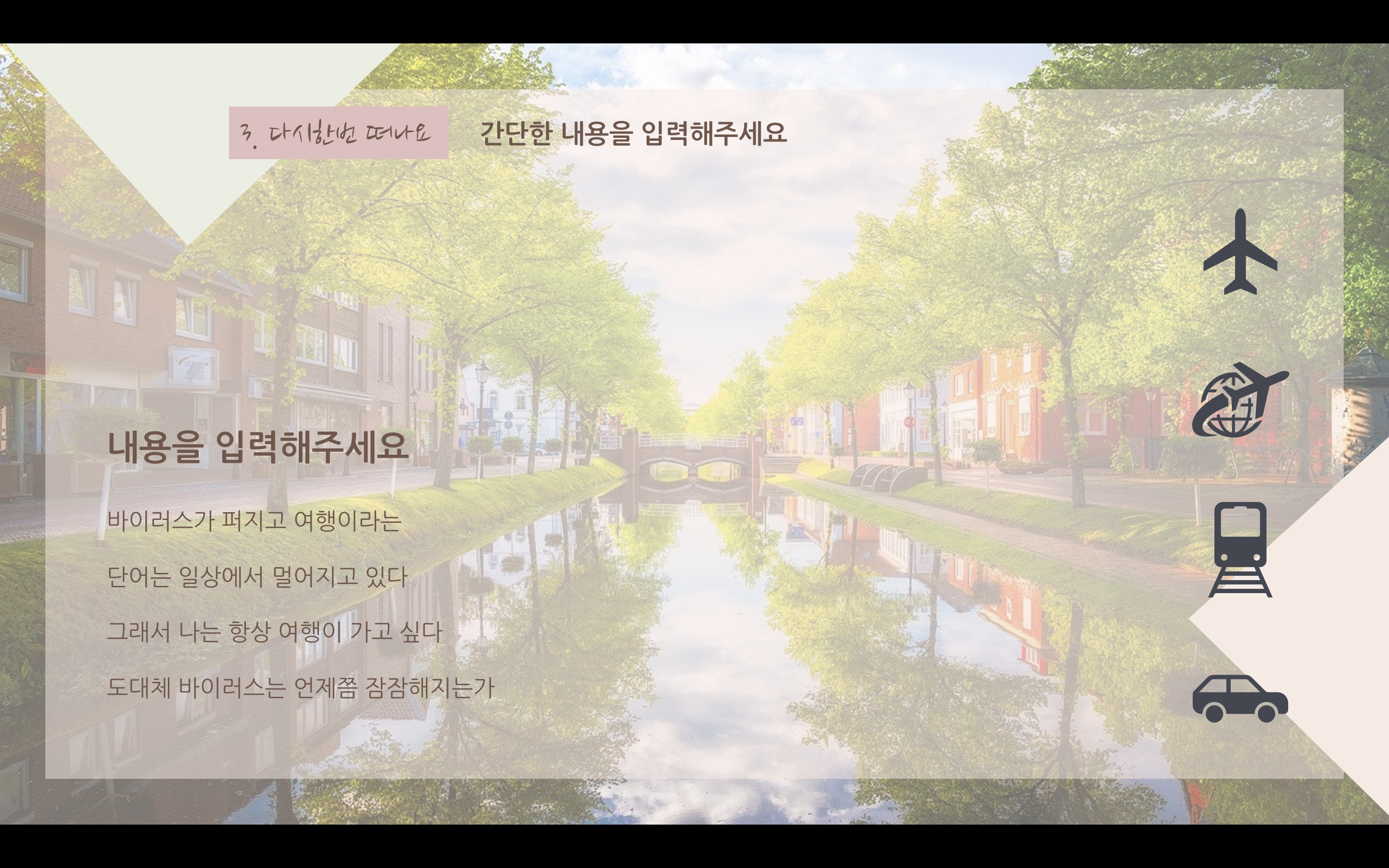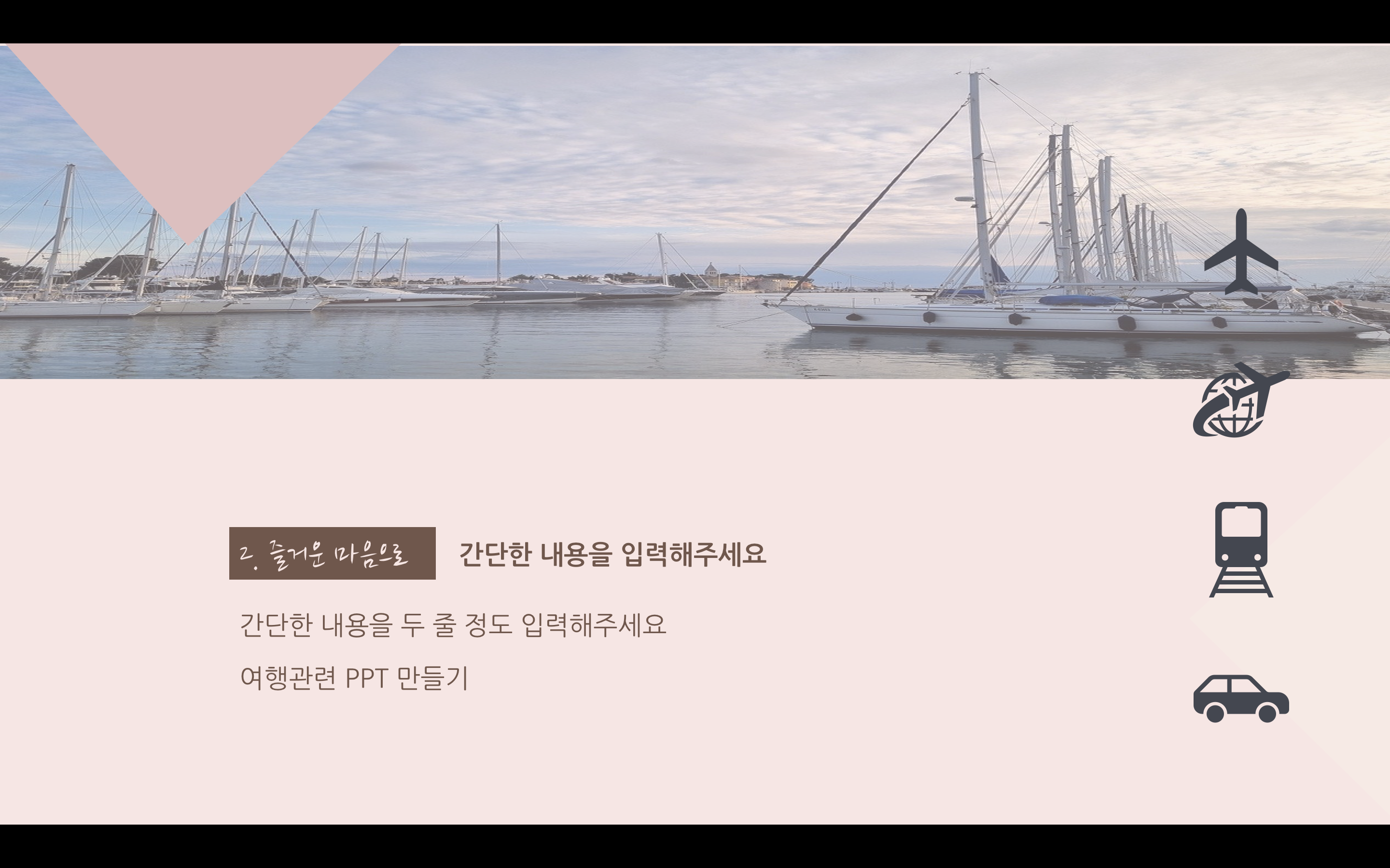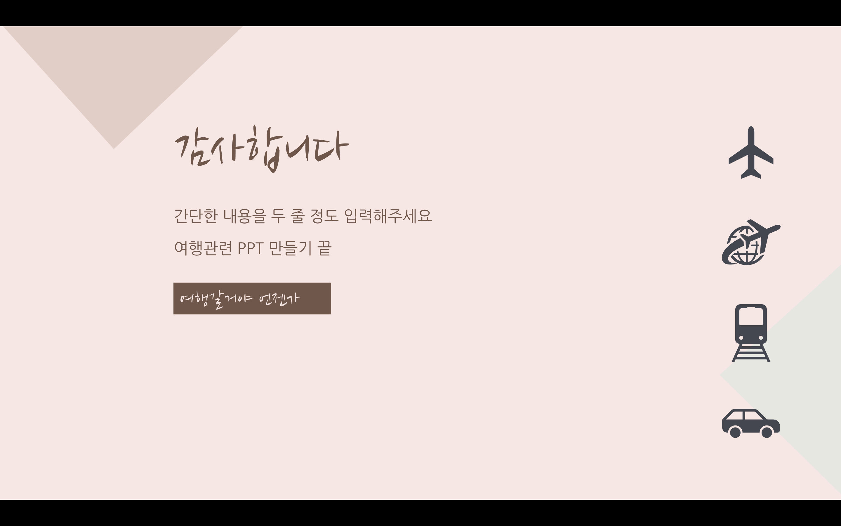 여행을 떠난 지 너무 오래된 느낌이지만 여행이라는 키워드 자체가 발랄한 느낌도 들고 여러 가지로 활기찬 분위기로 잡고 싶었으나 조금은 달달하게 해도 괜찮겠다 싶어서 누드 파스텔톤으로 만들어봤습니다. 파워포인트 PPT 역시도 색에 따라서 분위기가 완전히 달라지기 때문에 과제나 발표에 맞춰서 색 변경도 하시고 이용할 수 있도록 만들었으며 아이콘은 파워포인트에서 제공하는 걸 사용했습니다. 상업적 이용만 피해 주시고 마음껏 사용하세요.