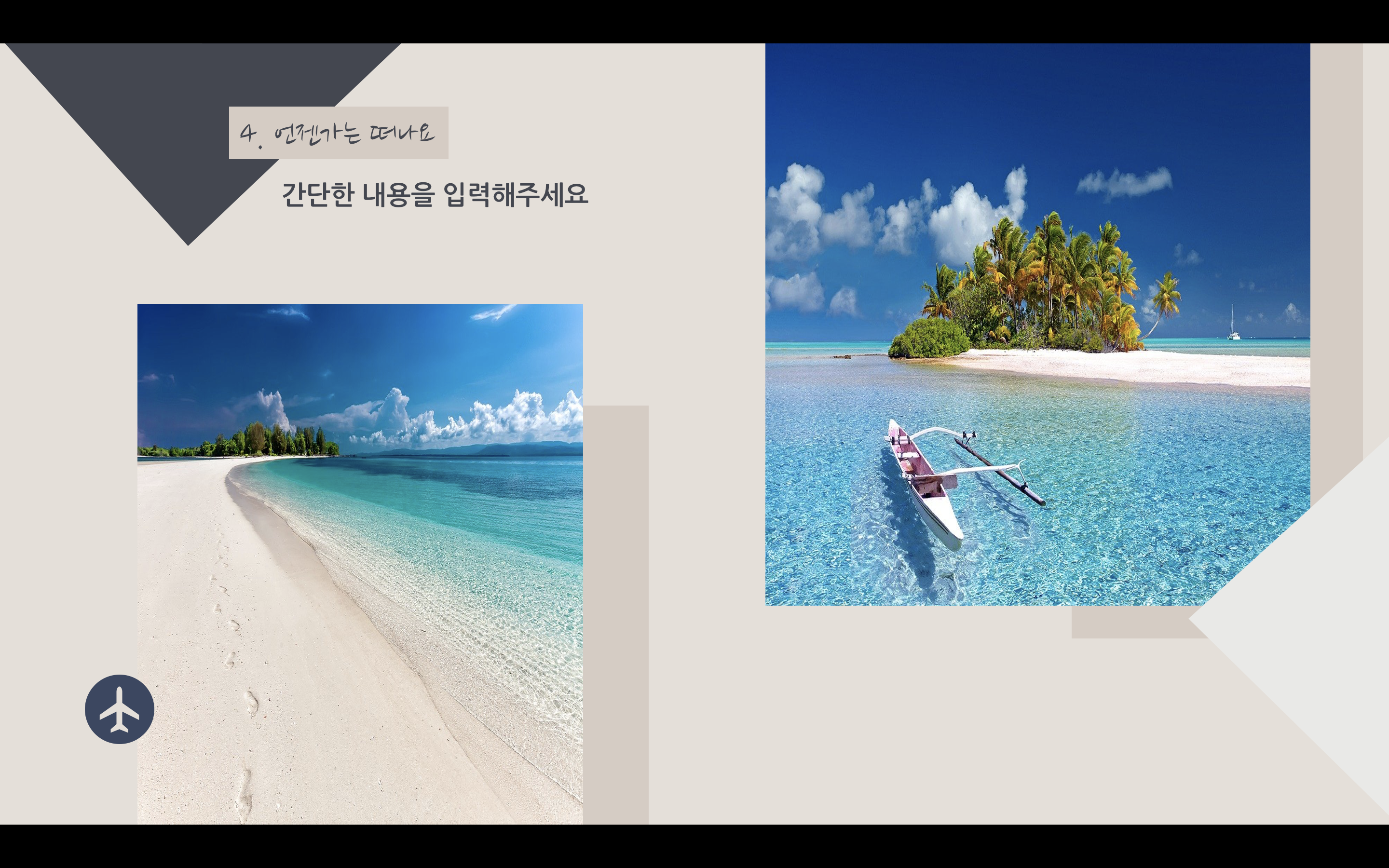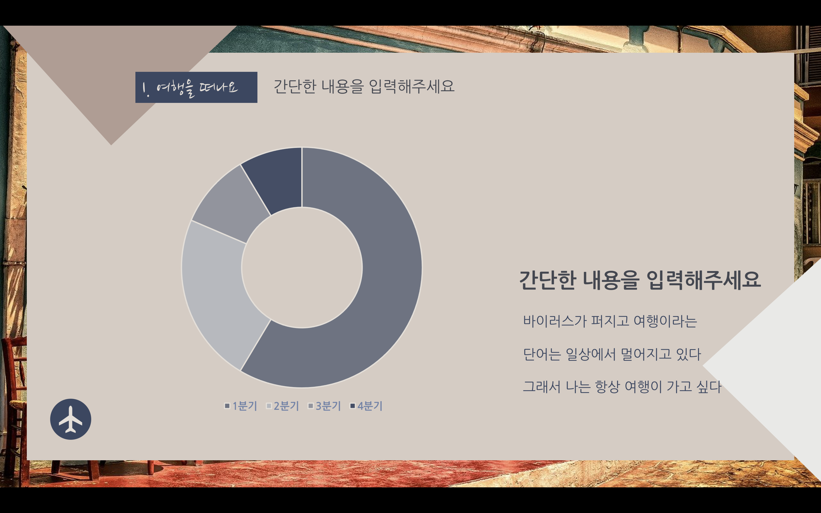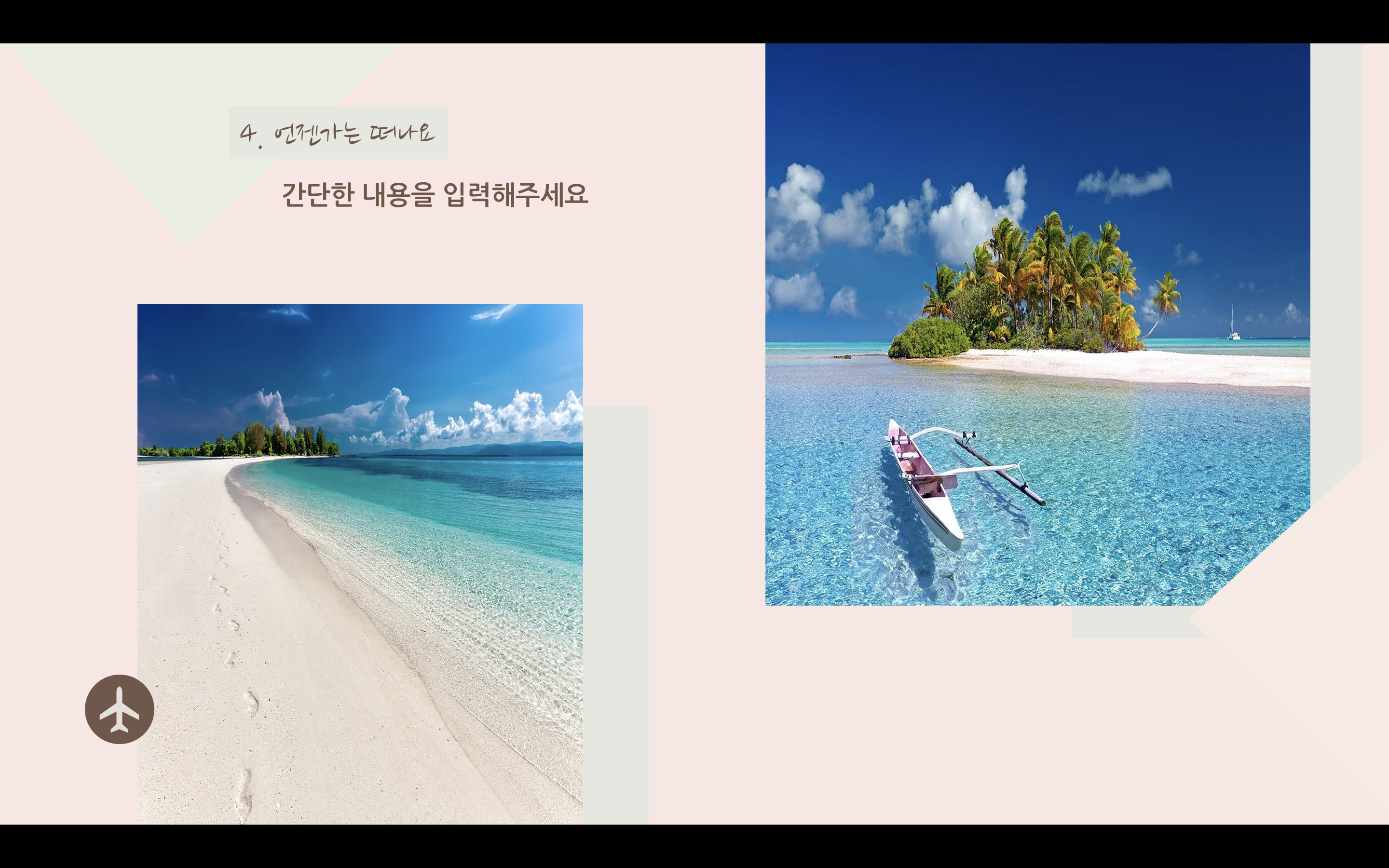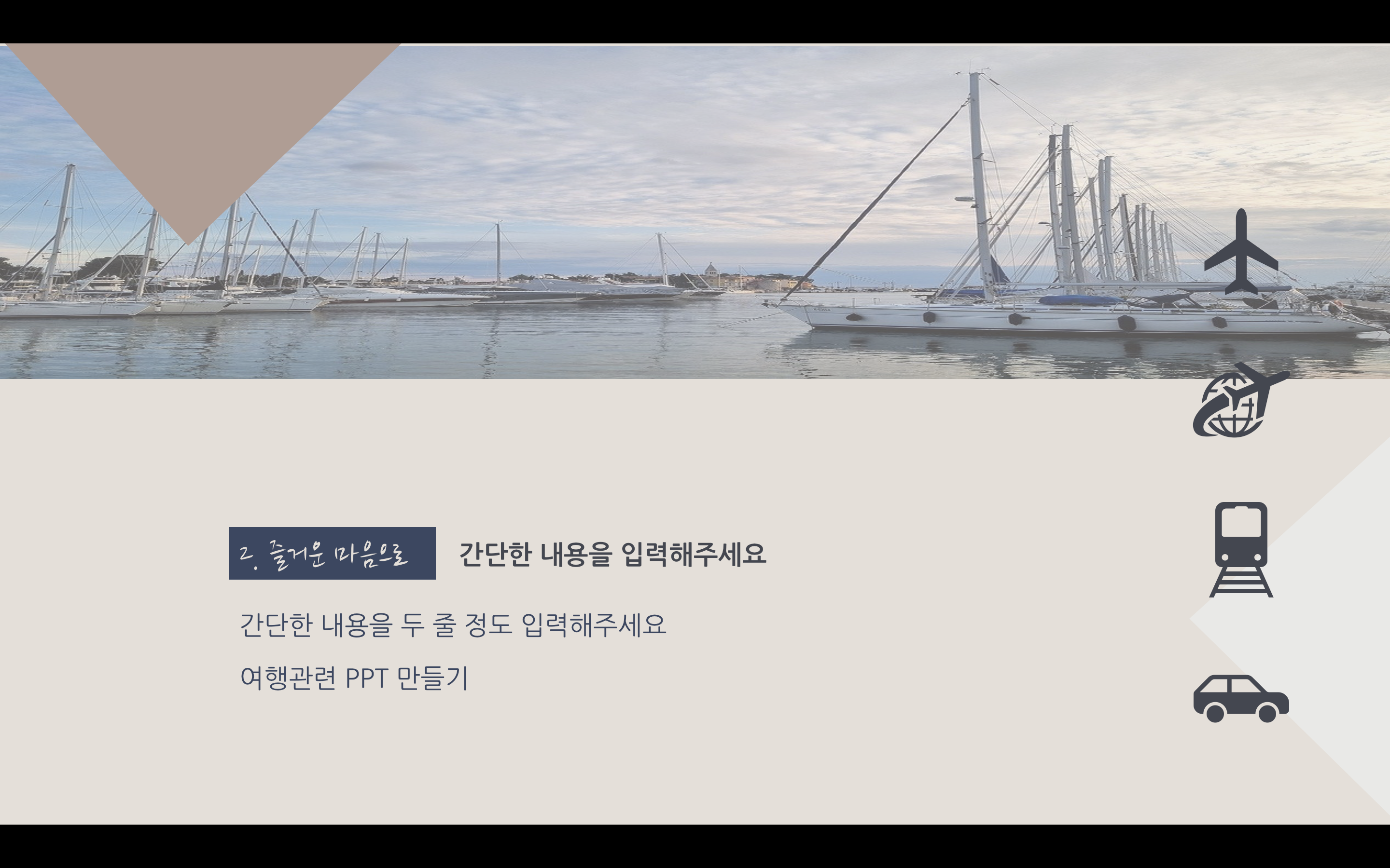 여행을 떠난 지 너무 오래된 느낌이지만 여행이라는 키워드 자체가 발랄한 느낌도 들고 여러 가지로 활기찬 분위기로 잡고 싶었으나 조금은 달달하게 해도 괜찮겠다 싶어서 누드 파스텔톤으로 만들어봤습니다. 파워포인트 PPT 역시도 색에 따라서 분위기가 완전히 달라지기 때문에 과제나 발표에 맞춰서 색 변경도 하시고 이용할 수 있도록 만들었으며 아이콘은 파워포인트에서 제공하는 걸 사용했습니다. 상업적 이용만 피해 주시고 마음껏 사용하세요.