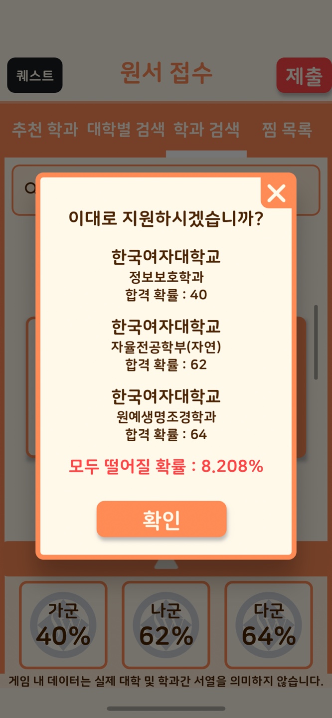 일일 퀘스트는 매일 00시에 갱신이 되는데 합격 확률이 분명 낮았는데 전화 합격을 받았다. (오 좋은데. 🥰) 쿠키 4개도 얻고 한국 여자 대학교에 입학도 하게 되었다. 의외로 원예생명조경학과에서 불합격을 받았다. (확률이 높아도 낮아도 이렇게 달라질 수 있음‼️)