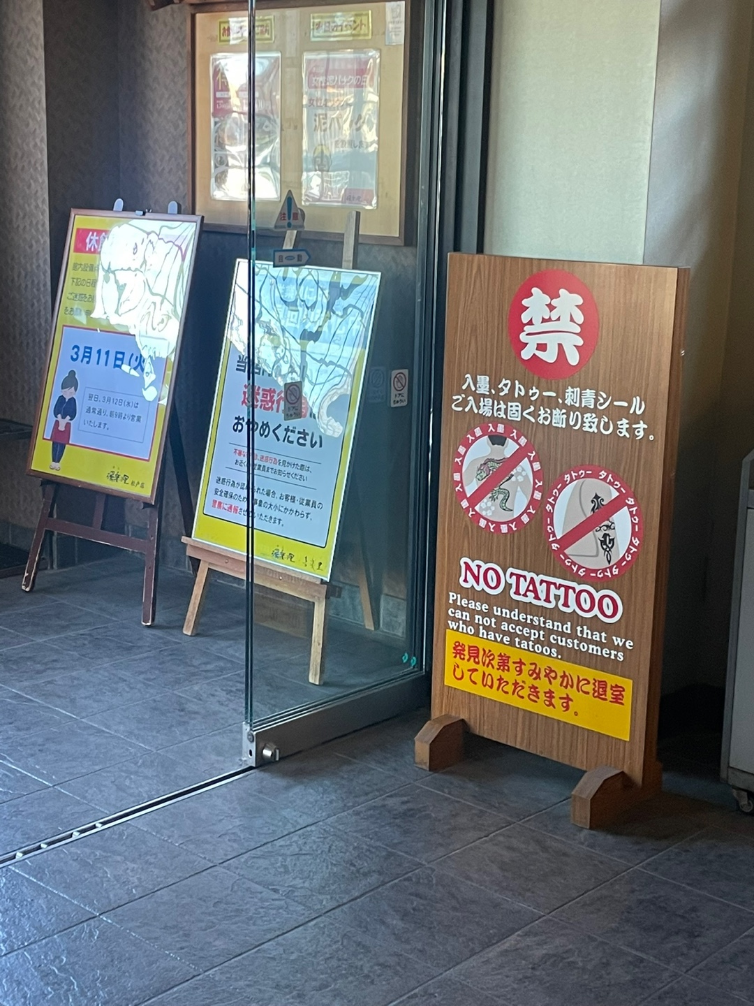그리고 동전을 챙겨가면 좋다. 돌려주기는 하지만 신발넣고 옷 넣고 할 때 동전이 필요하다. 앞에도 NO TATTOO.라고 쓰여있다. 개인 오천을 가야 한다. 근데 나는 가리고 잘 들어갔다.