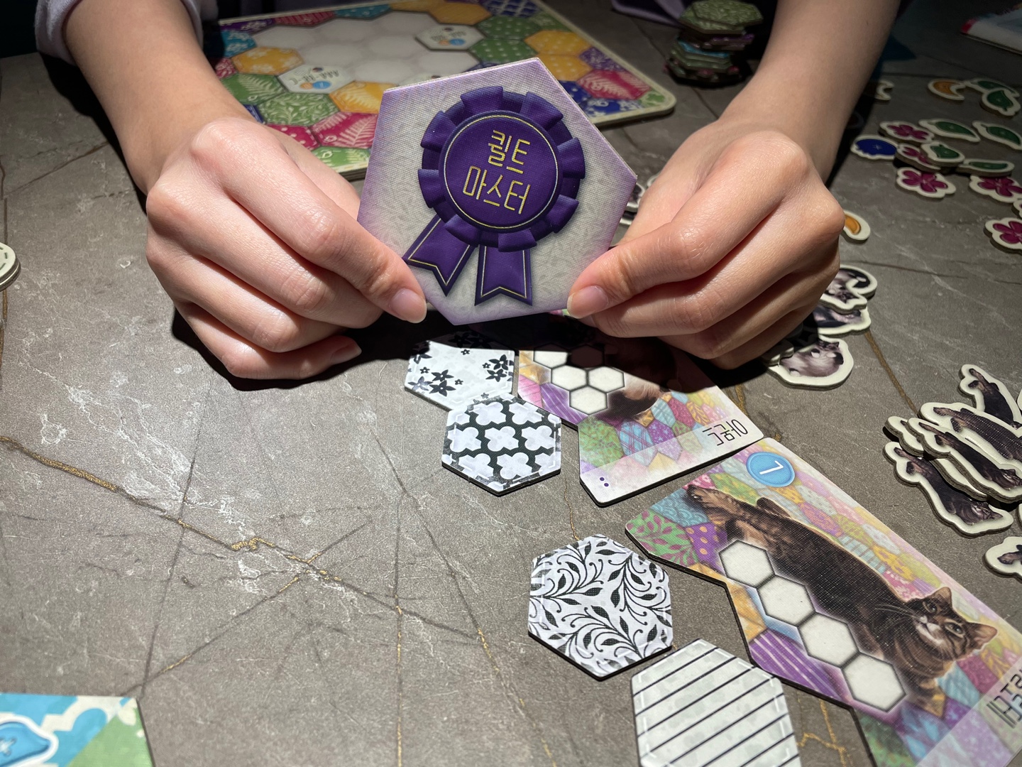 캘리코에서 우승을 하면 퀼트 마스터를 얻을 수 있는데 바로 내가 그 마스터를 얻었다. (이겨서 재밌었을지도.🐈) 더 많은 보드게임이 있지만 오늘은 이만 여기까지 추천을 마친다.