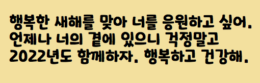 | HAPPY-2022 새해 복 많이 주세요! 친구들이 보낸 마음 읽어보기 (10) | 2022.01.01 |