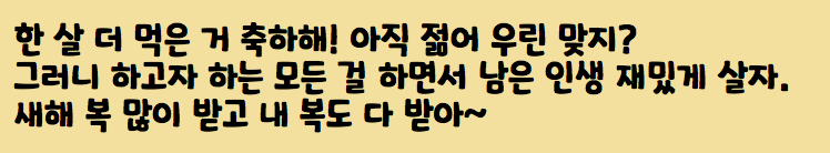 새해 인사는 다 거기서 거기라 딱히 꼭 들어가야할 말들이 비슷하지만 이런 긍정적인 말들이 전해진 상대는 매년 사람들이 하는 말들이지만 그래도 기쁠 거다. 이 말들을 들으며 새해를 시작하는 다짐이 느껴진달까. 하여튼 좋은 말들도 상대의 복주머니를 채워줄 수 있다면 좋은 챌린지가 될 거 같다.