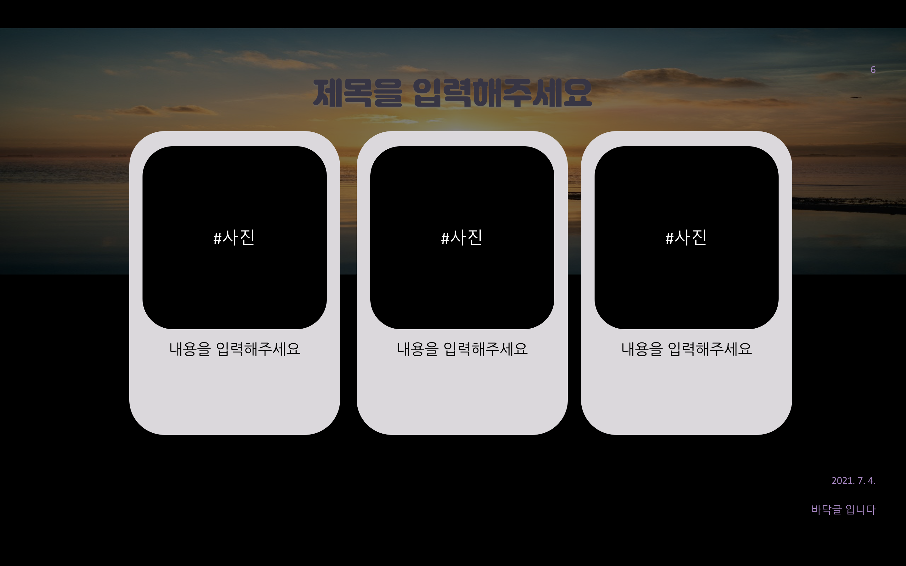 레이아웃은 간단하지만 색이 진하고 채도가 높아서 눈을 끌기는 적합한 색으로 만들었습니다. 요즘 자주 사용하고 있는 색이기도 하고 예전에 이 색들을 저장해 두고 계속 제게 남아있는 색들 중 하나입니다. 아이콘은 [author link]에서 만든 아이콘을 다운 받았습니다. 이미지는 무료 이미지를 다운로드하였기 때문에 다른 출처를 남기진 않았지만 출처를 꼭 주의해주셔야 합니다.