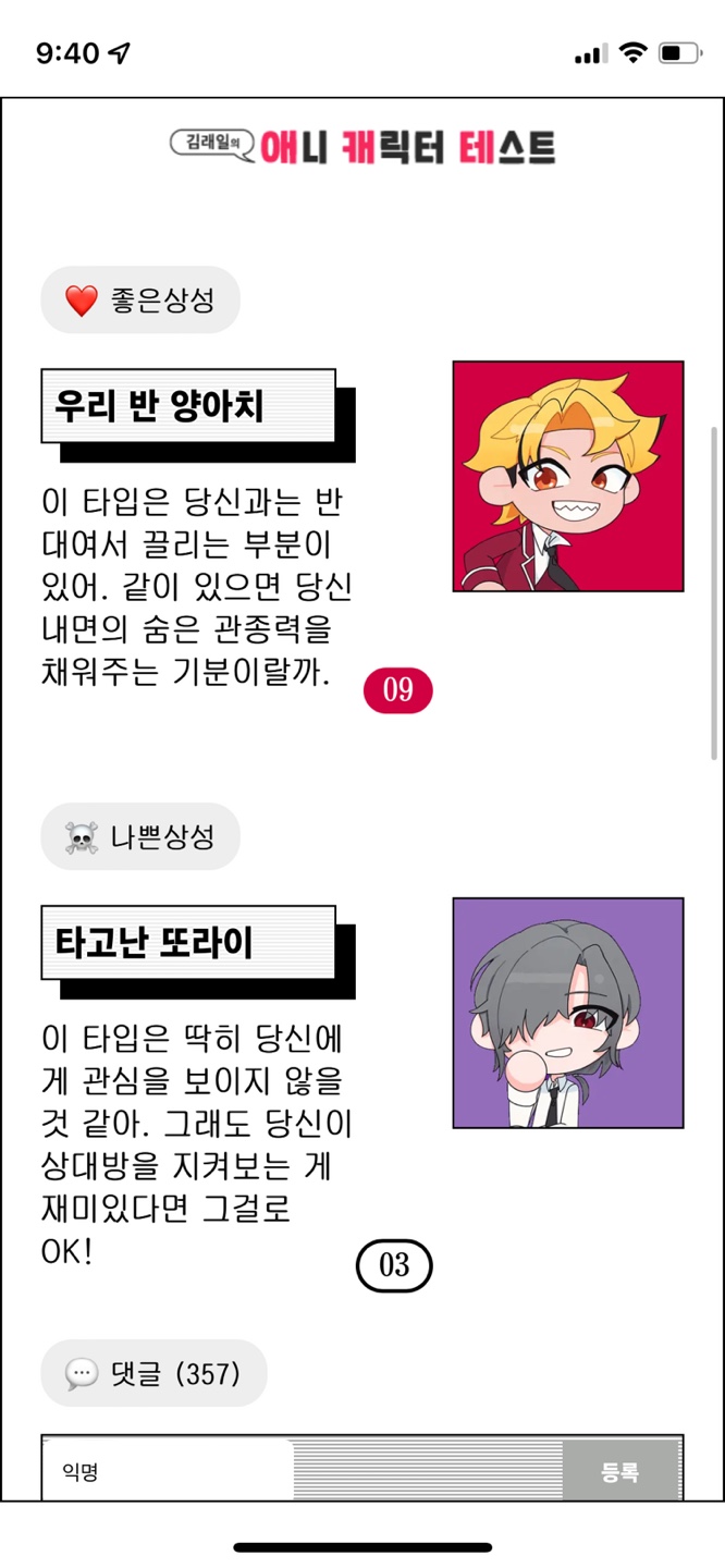 김래일의 애니캐 테스트 : 오타쿠 MBTI 해보기!