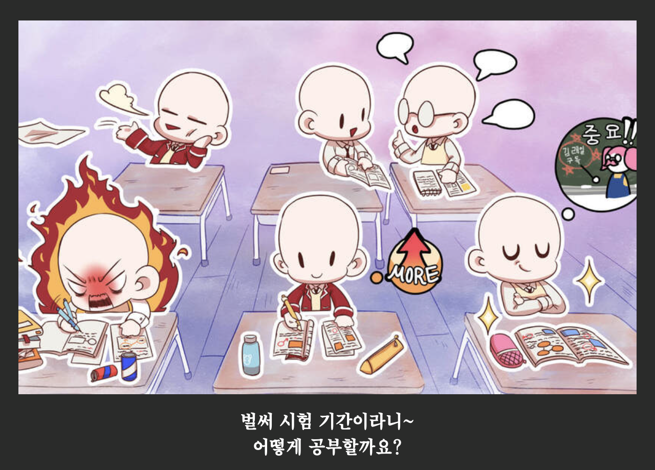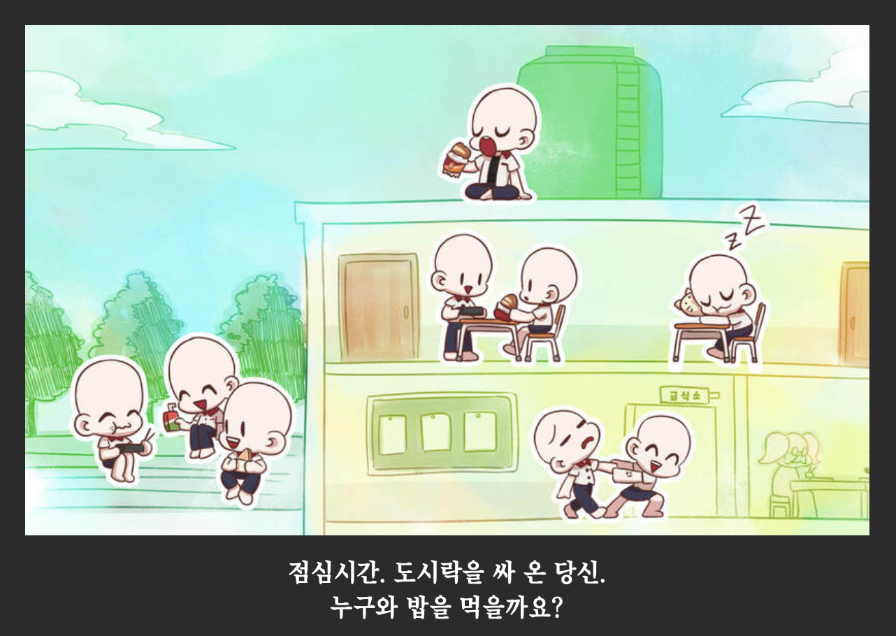 시험기간에는 더 분발해서 하는 선택지를 골랐고 그 다음 질문이 결과였는데 상위권이랑 공부했는데 생각보다 낮아서 아쉽다 중 고민하다가 상위권을 골랐다. 그다음 질문이 점심시간 도시락을 싸 온 당신 누구와 밥을 먹을까요?라는 질문인데 나는 고등학교 때 엄청 오지랖이 넓었고 어울리지 못하는 친구들이 엄청 신경 쓰였다. 그런 성격으로 꽤나 힘들었지만 나는 또 그렇게 할 거 같다.