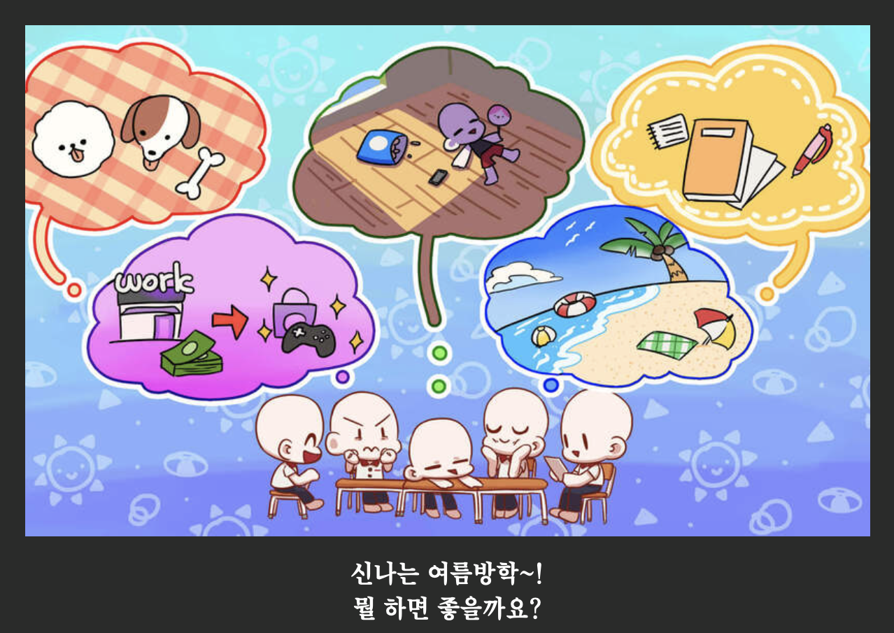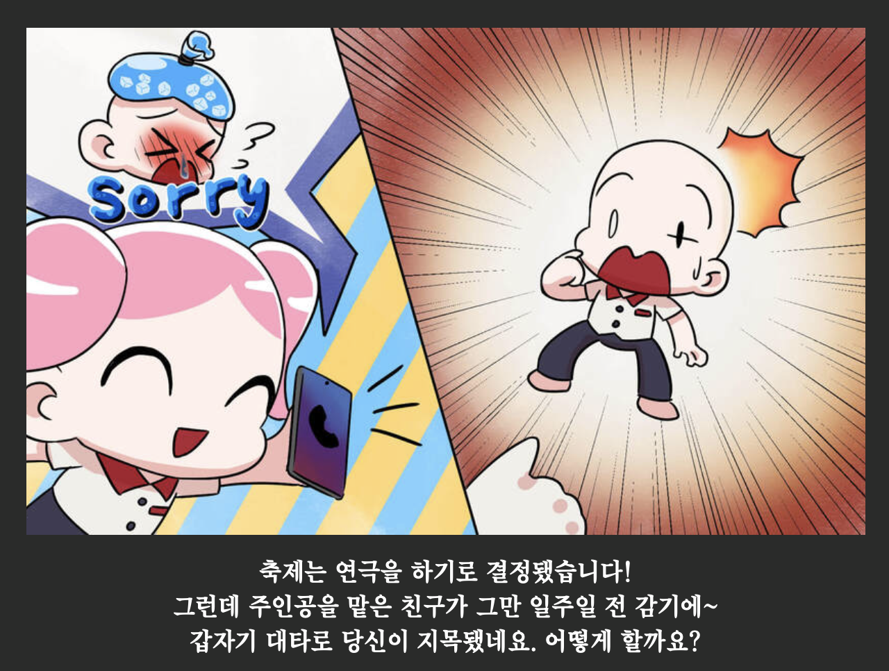 여름방학 때 내가 뭘 했지? 놀았던 거 같기도 하고 고등학교 때는 대입 준비를 했다. 그래서 대입 준비를 골랐다. 그리고 학교 축제는 의견을 따르는 쪽으로 했다. 나는 굳이 선택을 하려고 안 했던 거 같다. 결국 연극을 하기로 한 걸 보니까 고르지 않아서 다행인 거 같다. 그런데 주인공을 맡은 친구가 그만 일주일 전 감기에 걸렸단다. 왜 내가 대타인지 전혀 모르겠지만 까짓 거 그냥 한다. 사실 내가 더 잘할 거 같다.