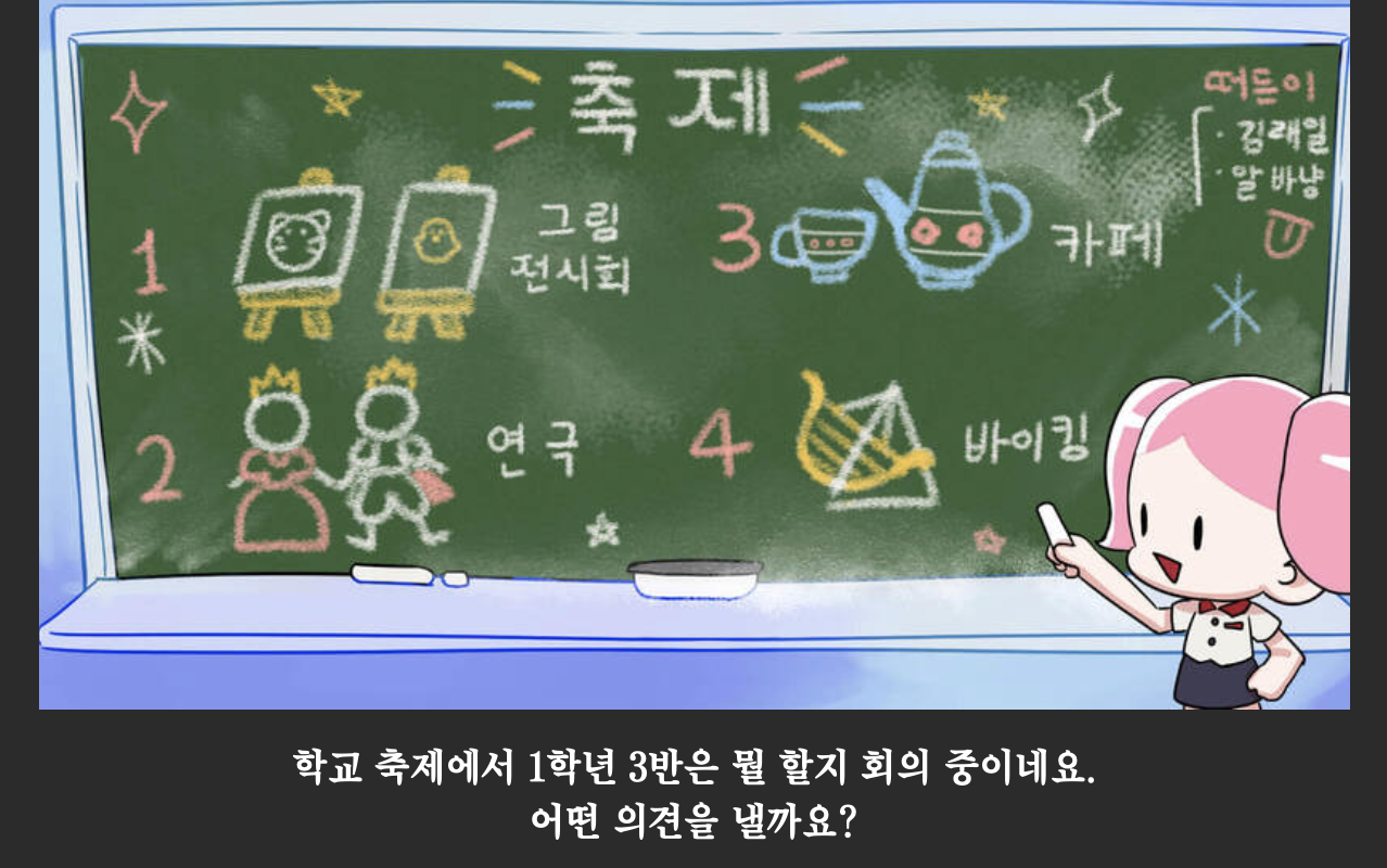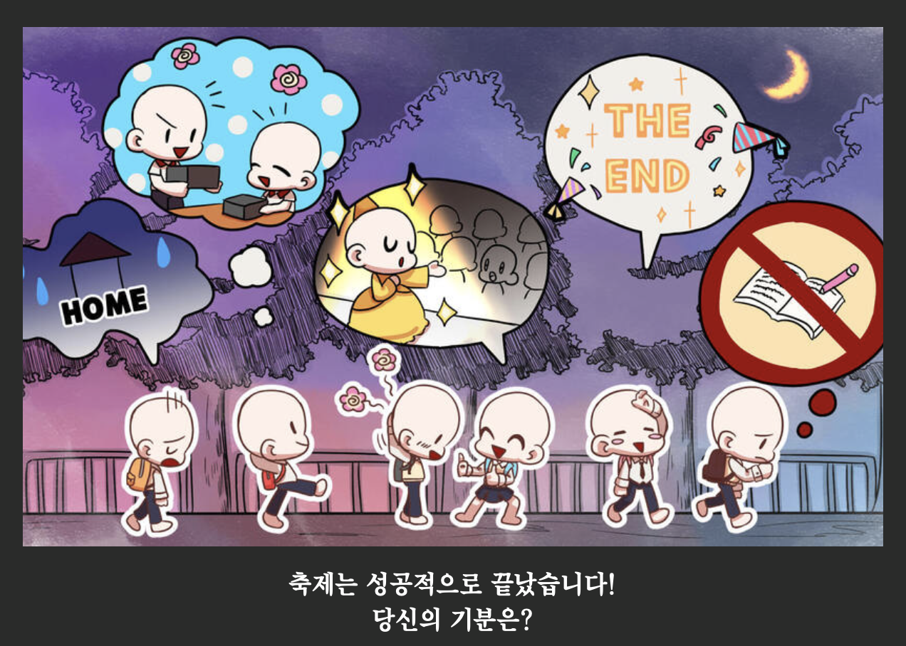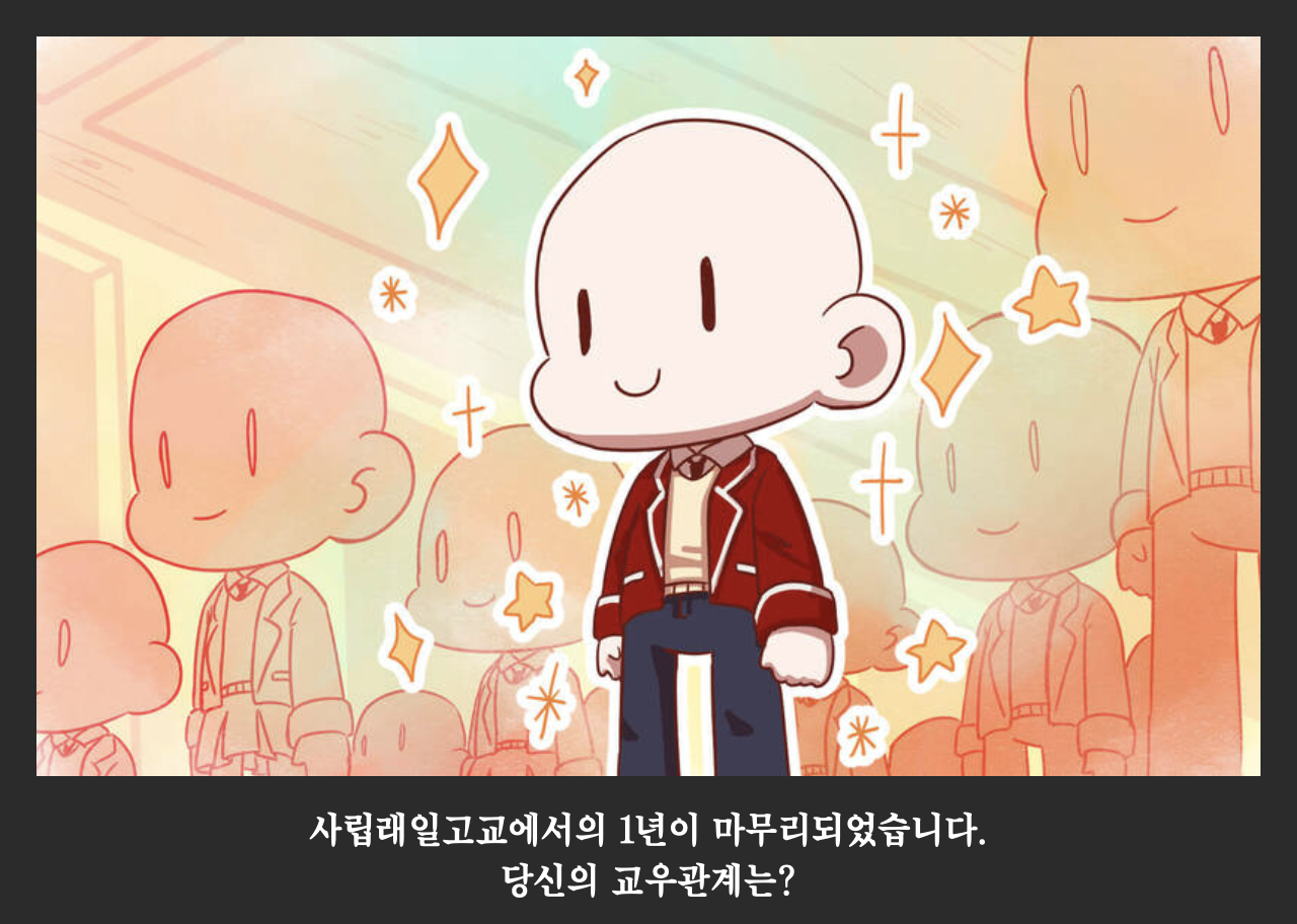 처음 질문에는 나는 '평범하게 입학식을 했다'를 선택했다. 두번째 질문에는 열심히 공부할 수 있는 맨 앞자리를 선택했다. 사실 그냥 내 고등학교 때 시절에 대부분 앞자리에 앉아있었고 실제로 따로 선생님께 앞에 앉고 싶다고 한 적도 있어서 선택이 어렵지는 않았다.