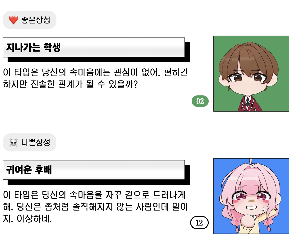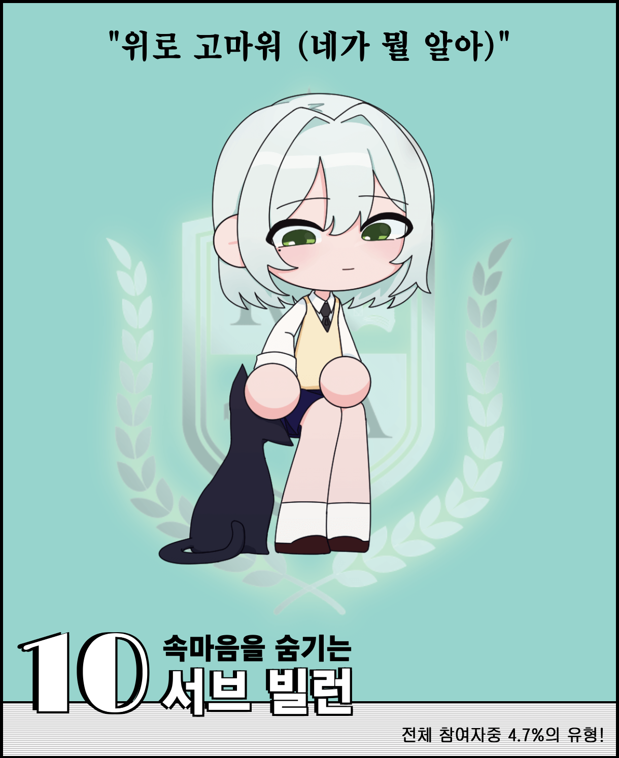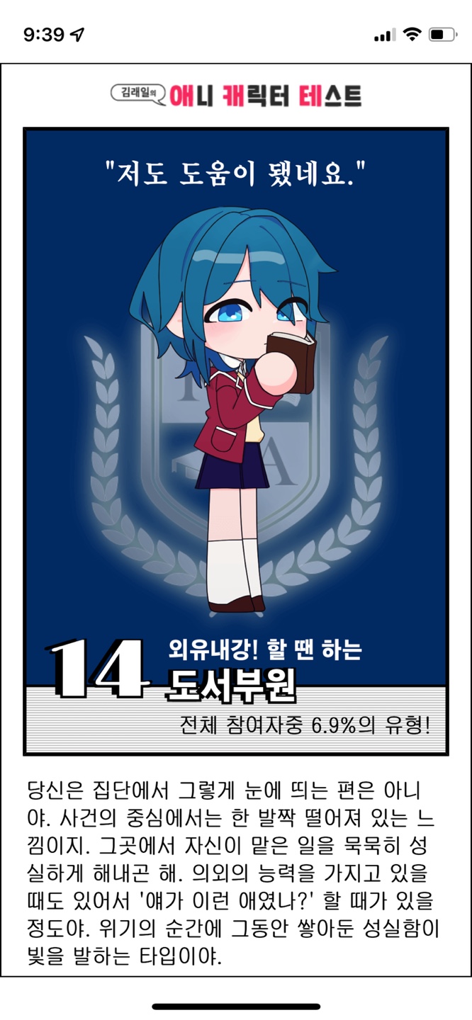 나는 원래 INTJ이고 서브 빌런은 설명을 보니 겉으로는 언제나 예의 바르고 성실한 당신은 사실 그 누구에게도 말하지 않은 속마음이 있다. 당신은 착한 사람을 연기하는 거로 생각하고 있지만, 애초에 상냥한 사람이 아니라면 그런 연기 따위는 하지 않는다. 그런 본성 때문에 빌런 캐릭터로서 주인공을 향한 계락을 세우다가도 실패해버리고 말아. 정말이지 귀여운 빌런이라고 되어있다. 이거 보면서 그냥 나라고 생각했다. 나를 캐릭터로 만들면 정말 서브 빌런일 거 같다. 나는 내가 착한 본성이 있다는 것을 알지만 그다지 착한 사람은 아니다. 딱 맞는 거 같아서 신기했고 그다음으로는 ISFJ한테도 해보라고 했는데. 결과는 도서부원 나왔다.