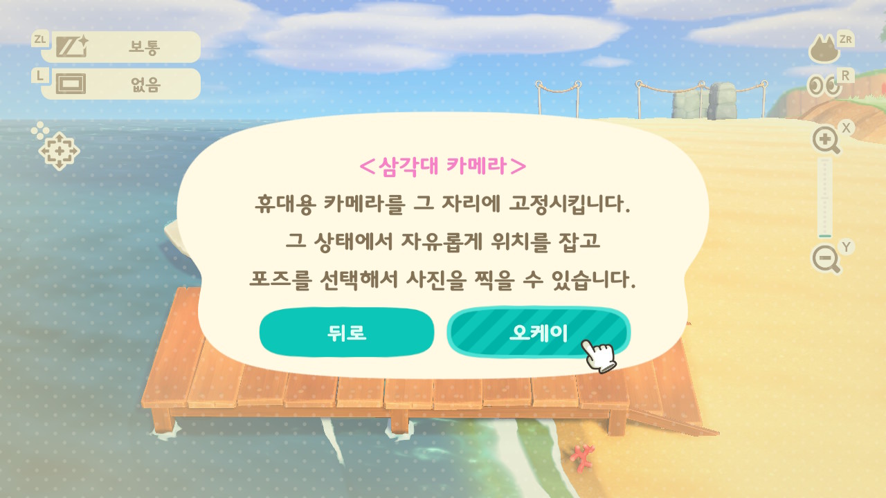모여봐요 동물의 숲 업데이트에서 가장 기다린 카메라인데 너무 행복했다. 1,500마일로 마을회관에서 교환하고 실행하면 된다. PRO 카메라 설명서를 보면 -버튼을 누르면 휴대용 카메라, 삼각대 카메라로 종류를 바꿀 수 있다. 삼각대 카메라는 휴대용 카메라를 그 자리에 고정시키고 그 상태에서 자유롭게 위치를 잡고 포즈를 선택해서 사진을 찍을 수 있으며 휴대용 카메라는 자신의 눈높이로 카메라를 들고 다이내믹한 사진을 찍을 수 있다. 휴대용 카메라 진짜 좋다.