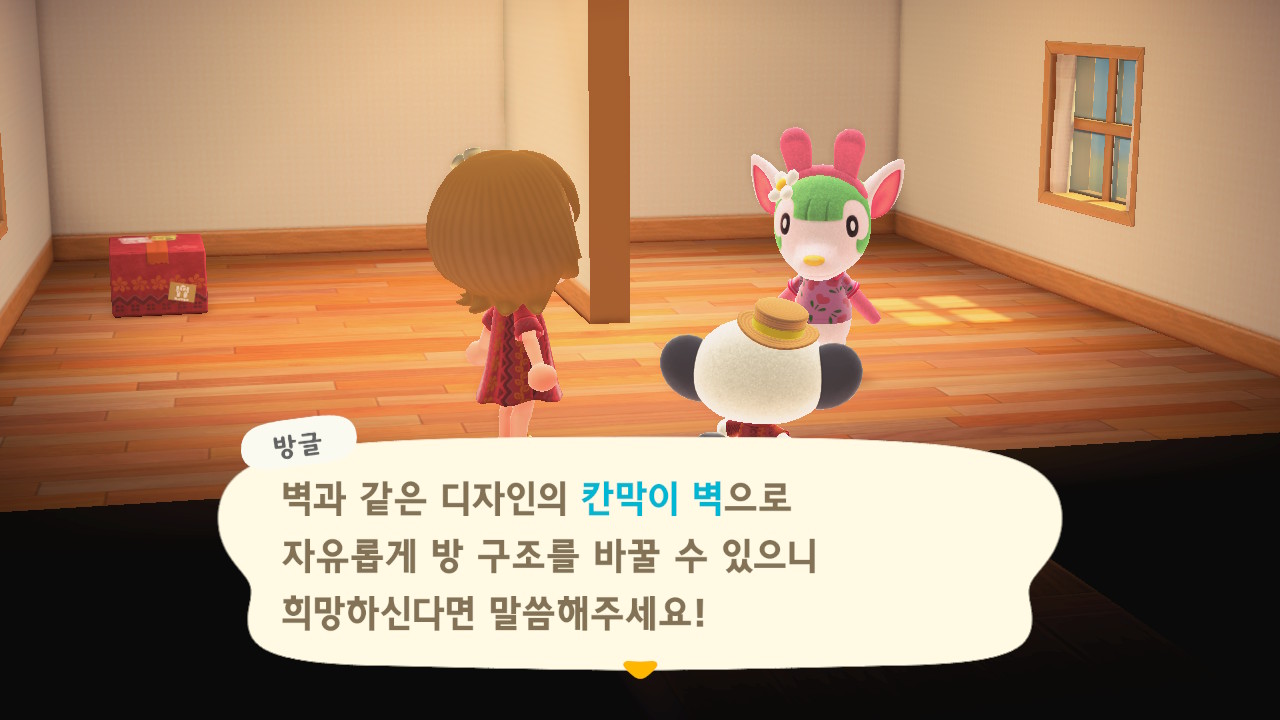 칸막이 벽이라는 기능이 생겼고 DIY를 받아서 내 섬에서도 자유롭게 사용할 수 있게 되었다. 칸막이 벽은 방글이가 자신의 아이디어라며 잘 활용하길 바란다고 한다. 기타에 추가되었기 때문에 자유롭게 사용할 수 있다.